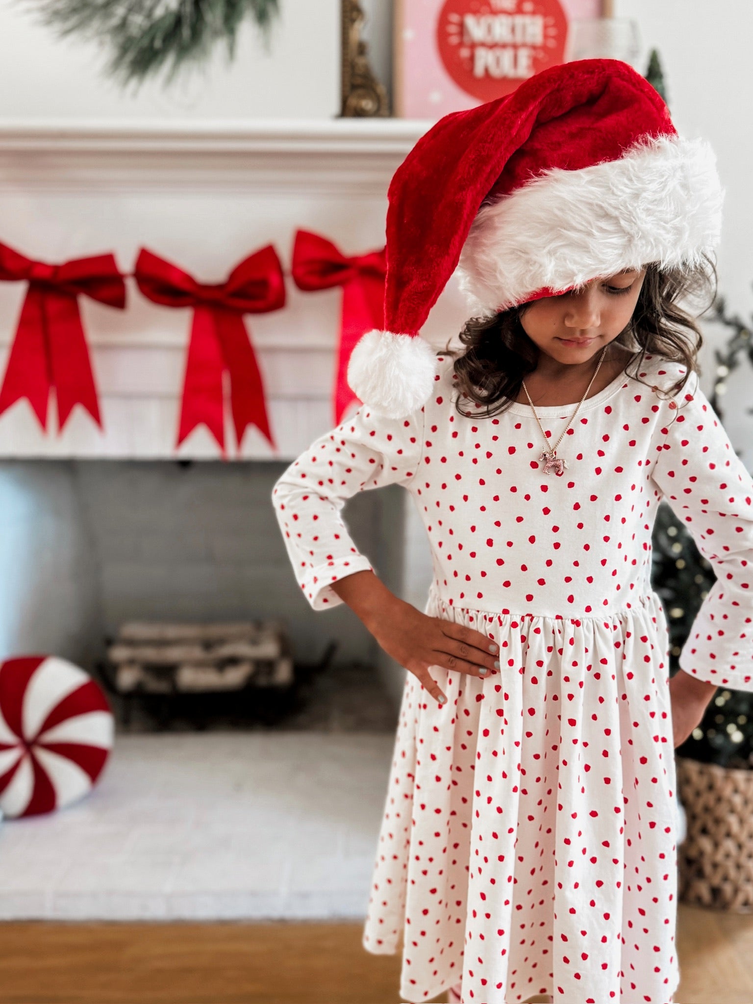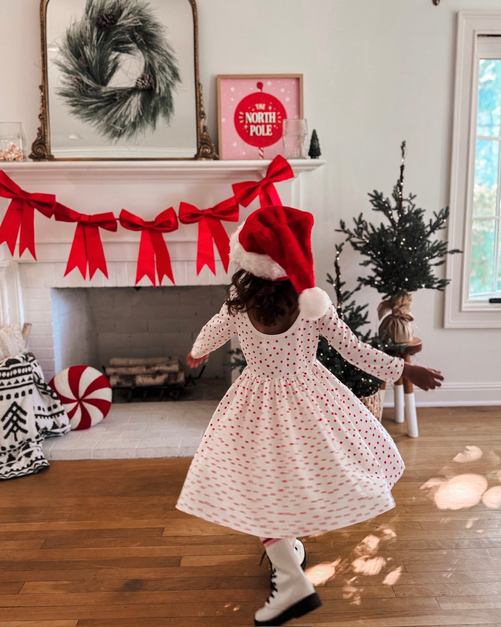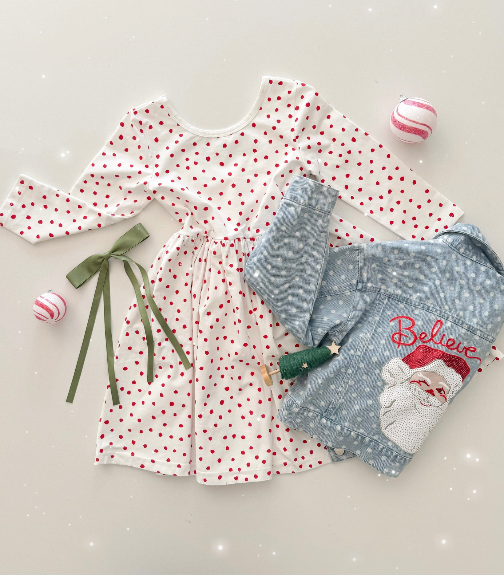 So cute and layers perfectly with our holiday sherpa & denim jackets! Printed on a white background, super soft fabric, a scoop neck back, 3/4 sleeves and is gathered at the waist for the perfect twirl!