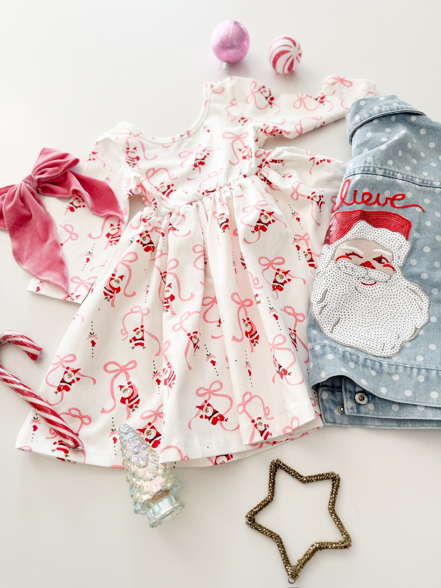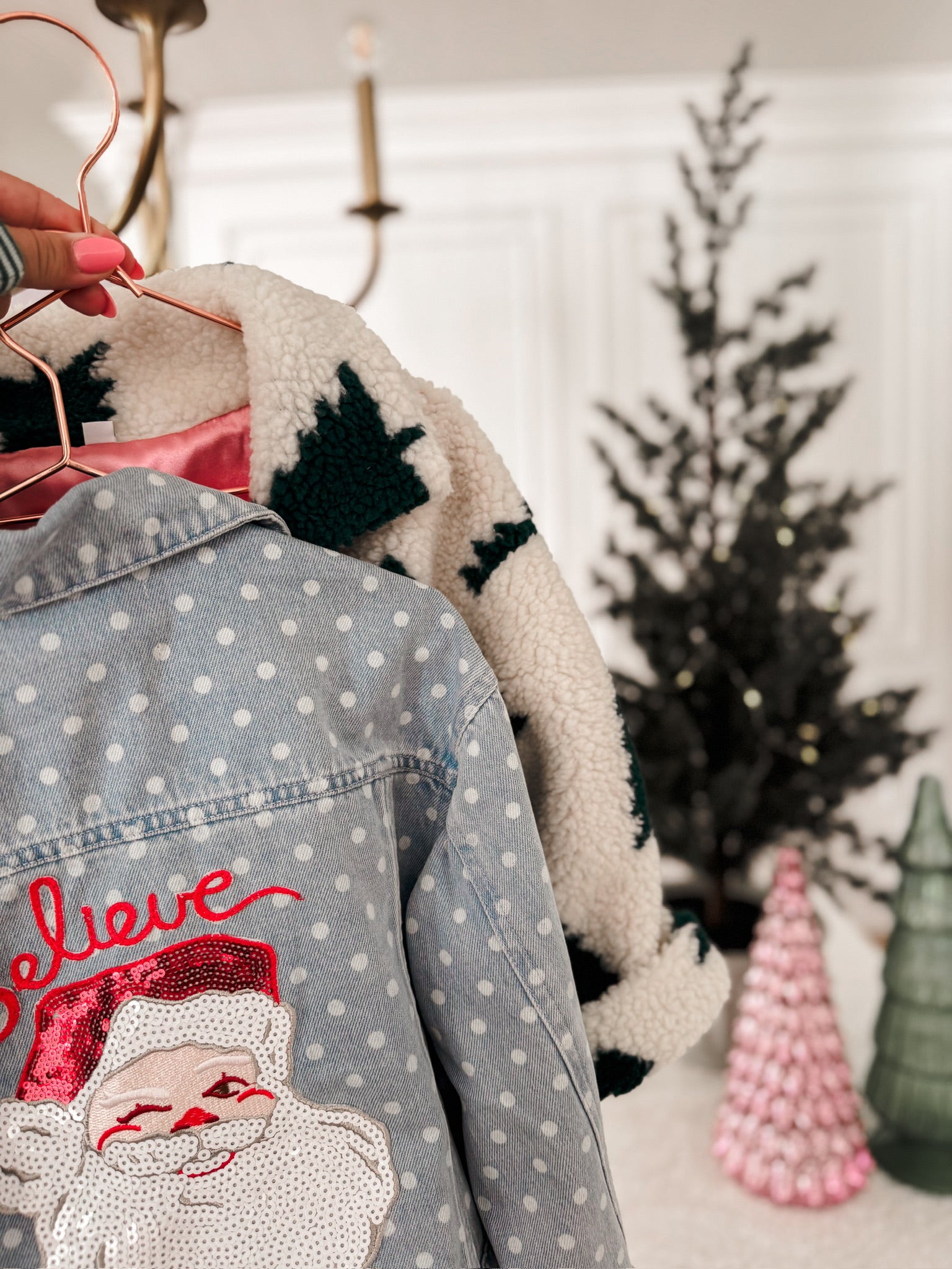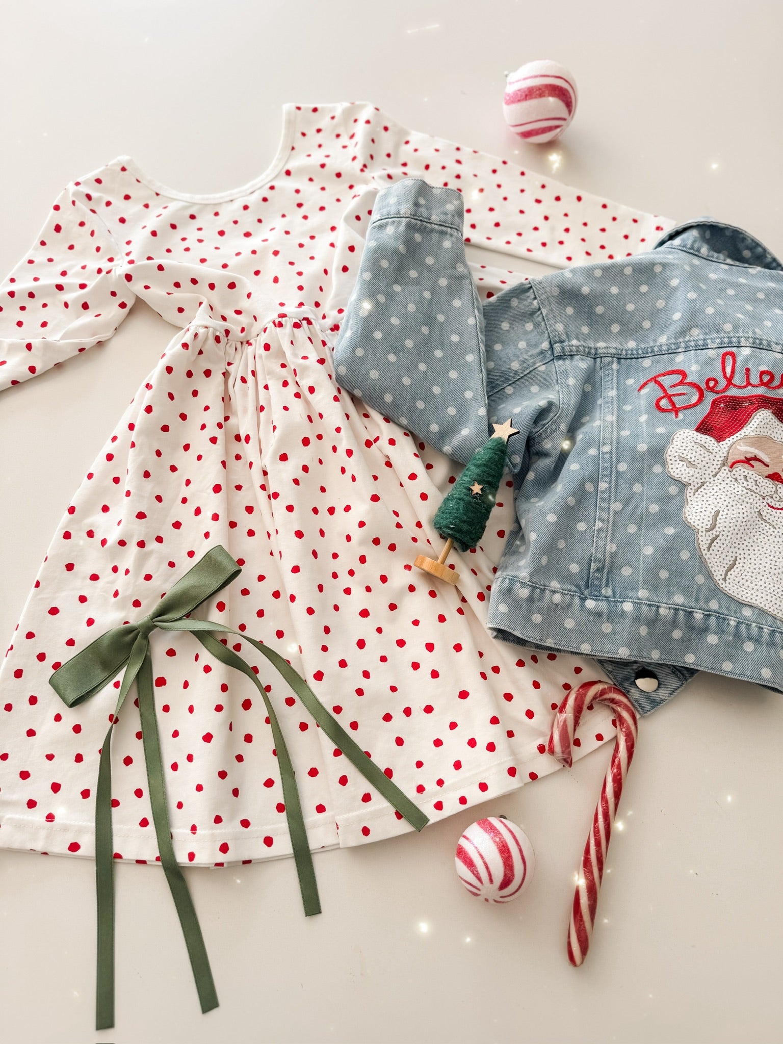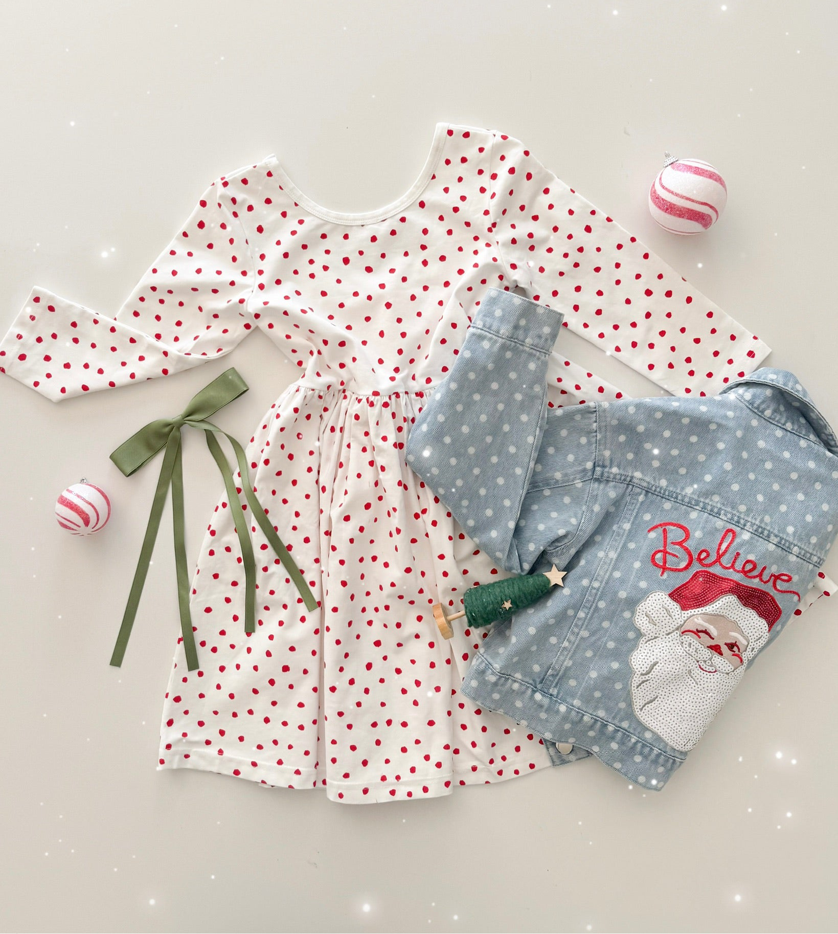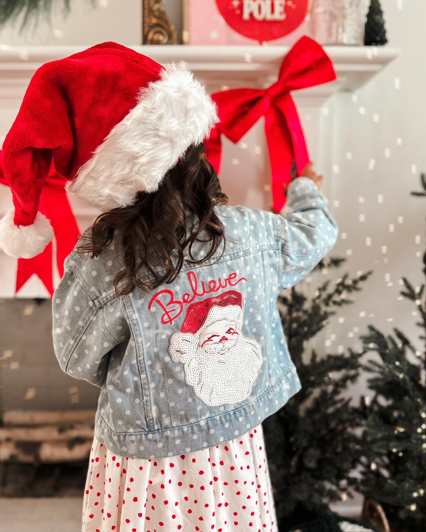 Our softest denim yet with a vintage feel. Faded polka dots all over and a gorgeous sequin Santa on the back. The word "believe" is embroidered with the most festive red color. Bringing all the whimsical and nostalgic feels this holiday season! Pairs so cute with just about anything, including our holiday twirl dresses!