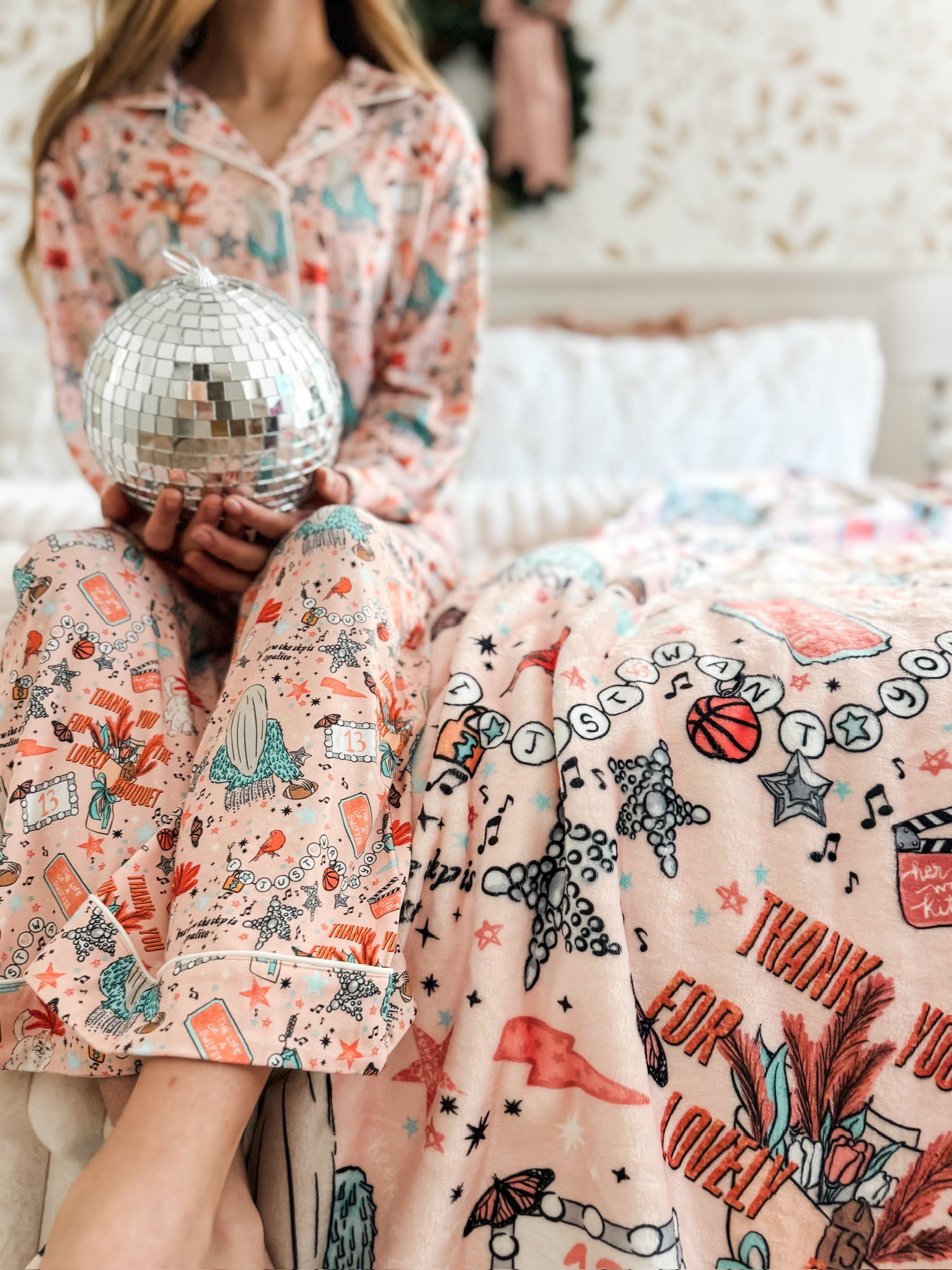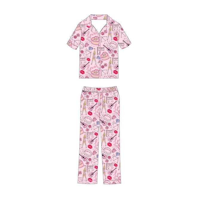From Paper rings to cupids arrow, lover cakes, favorite lyrics, red lips + more. This PINK has your heart. By huge demand, we are opening pre orders for this print in our most loved bamboo pajamas! Matching sets for you and your tiny Swifties. Two piece set includes cozy pajama bottoms and a button down top (short sleeve)