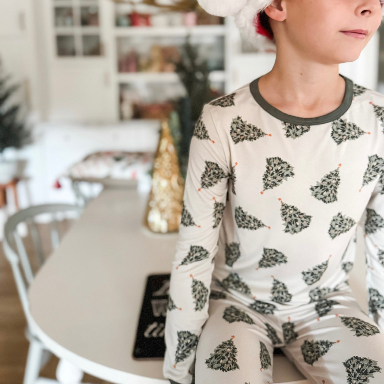 This collection with its simple yet nostalgic print is so perfect for movie nights, holiday festivities and more! Kids sets are our traditional two piece sets (no buttons). Baby sizes are zipper onesies.