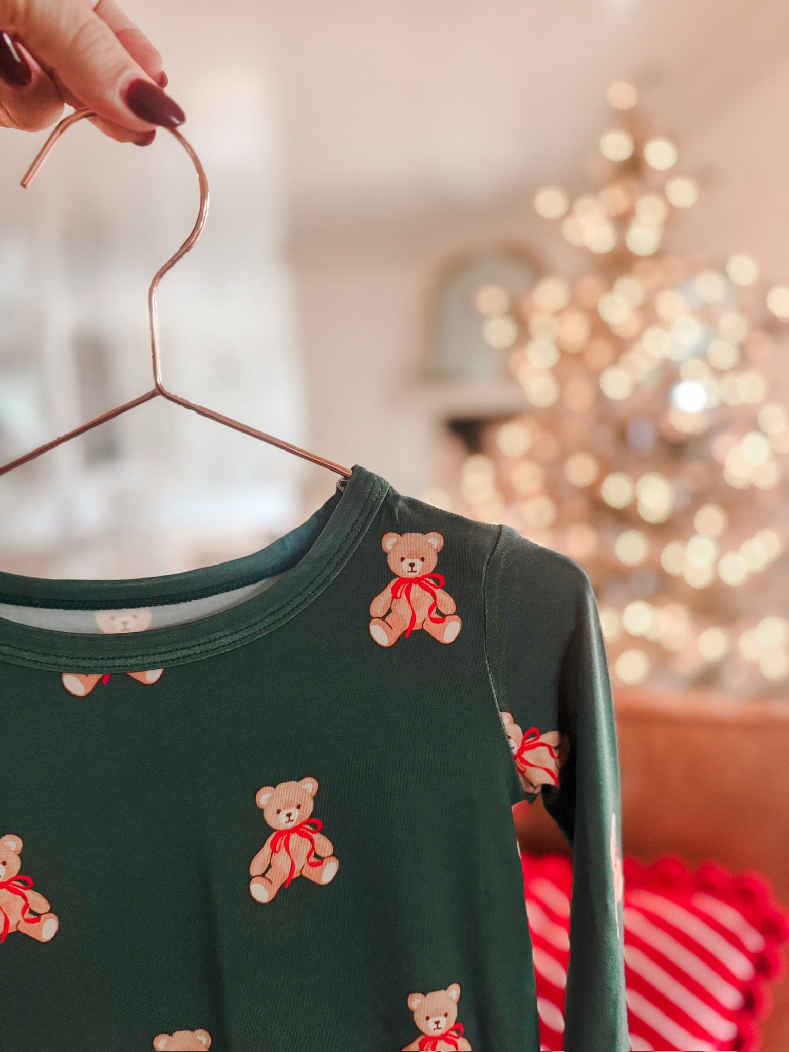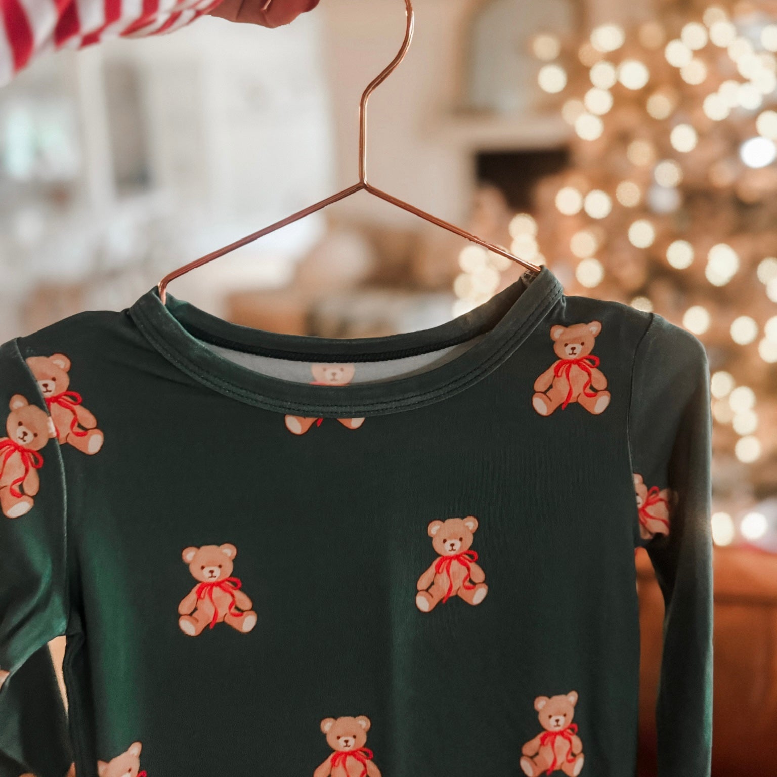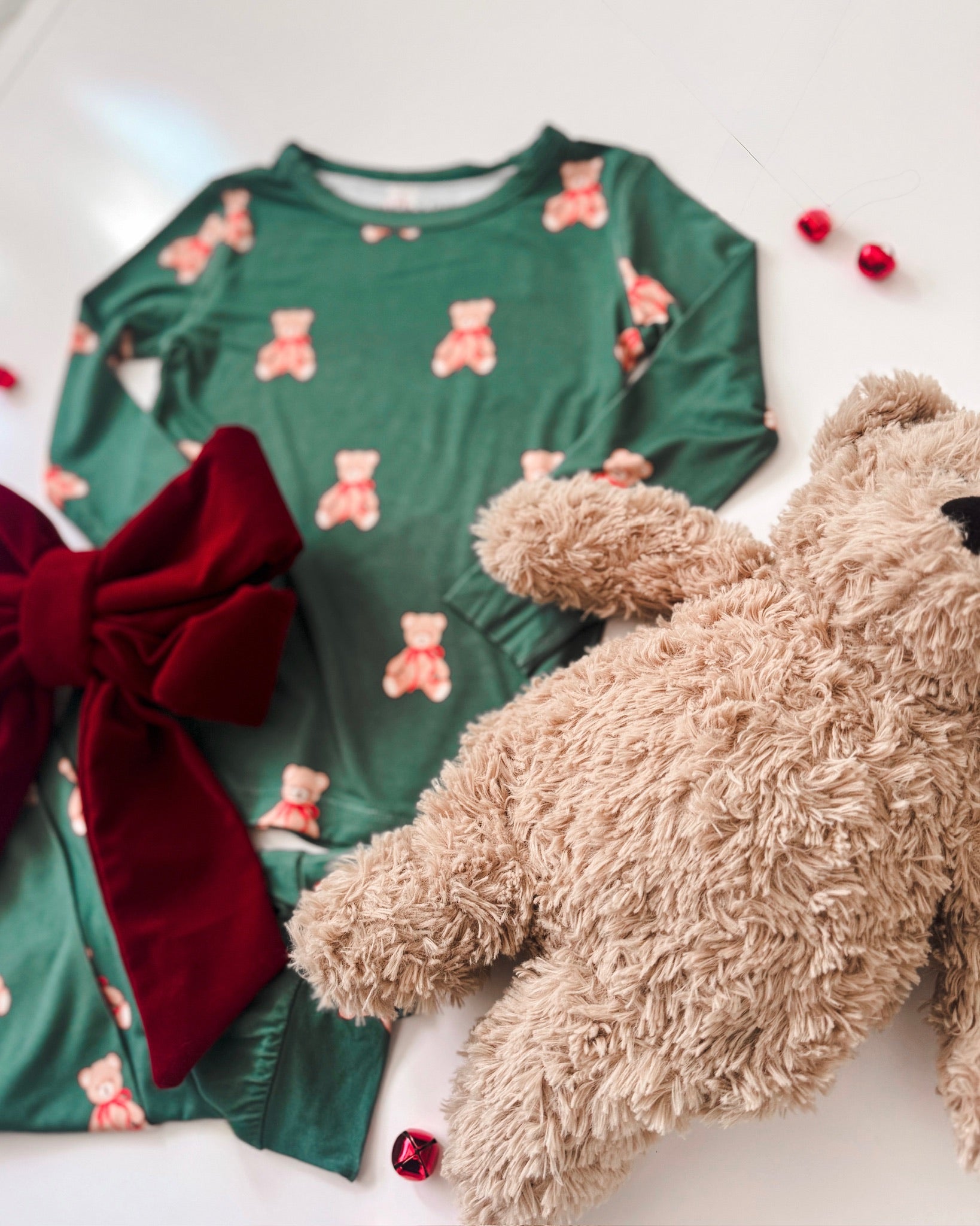 All the cozy comfy teddy bear vibes... This collection with it's simple yet nostalgic print is so perfect for movie nights, holiday festivities and more! The deep forest green and classic teddy bear with the pop of red in the bow make it perfect for Christmas and all winter season long.