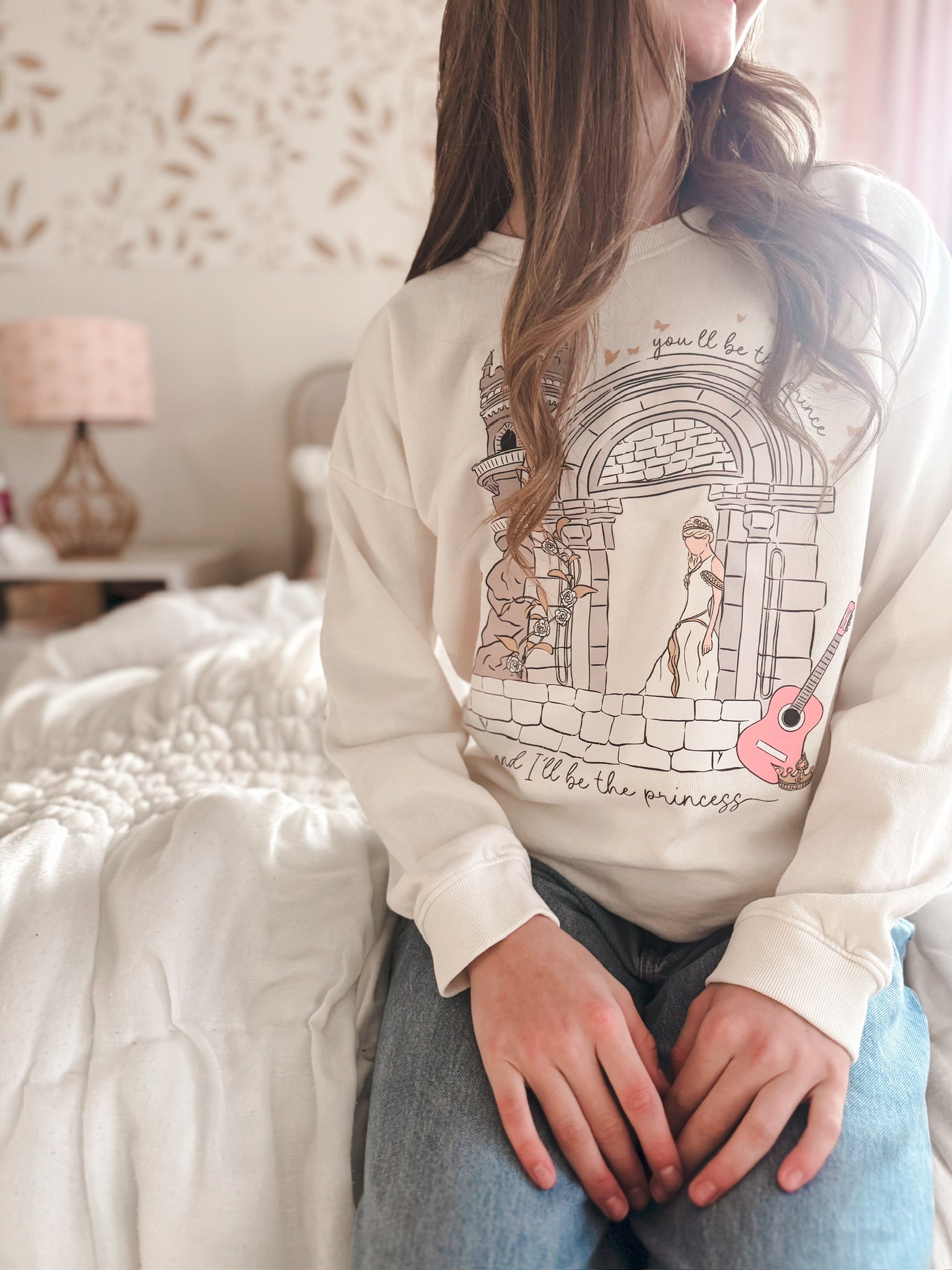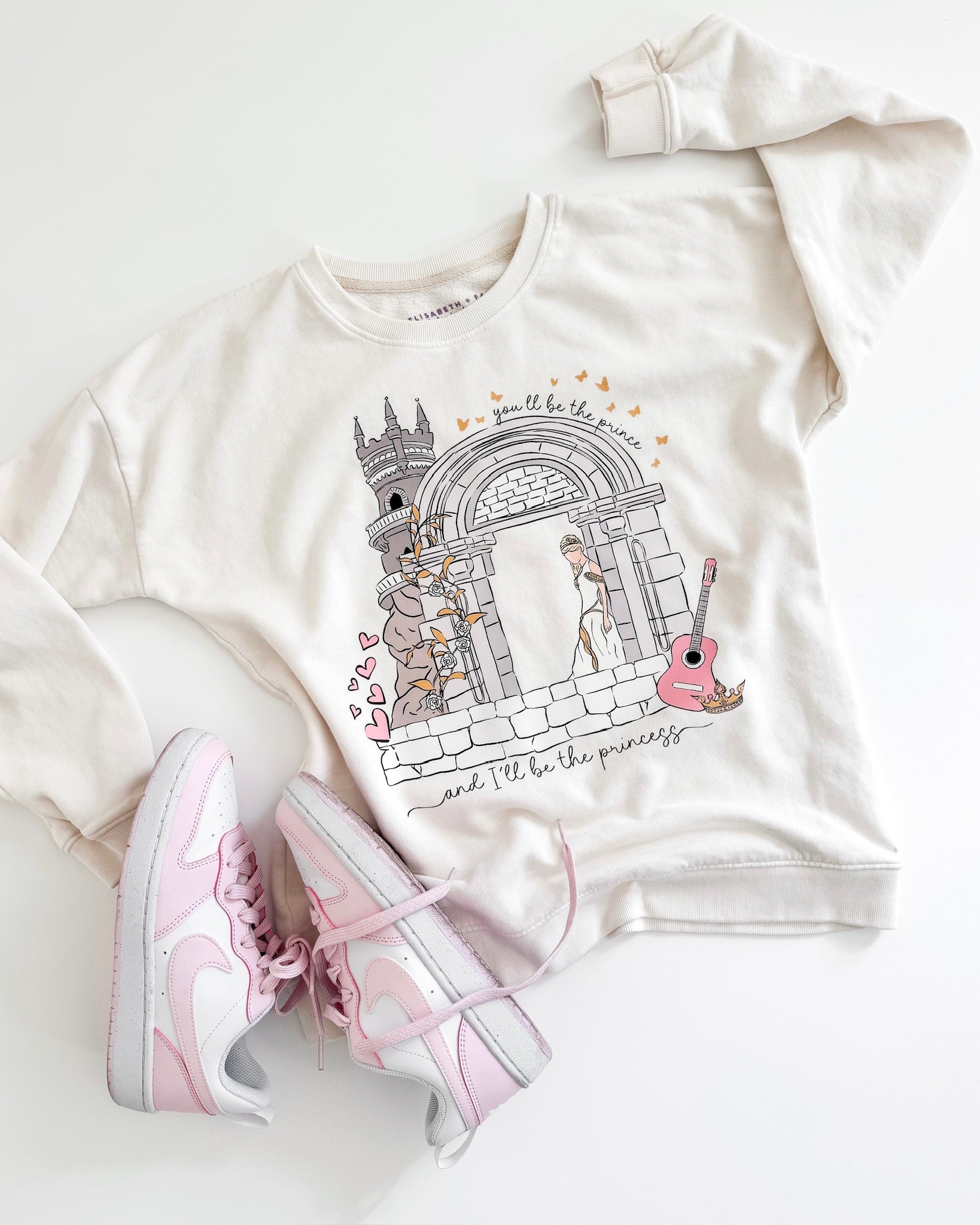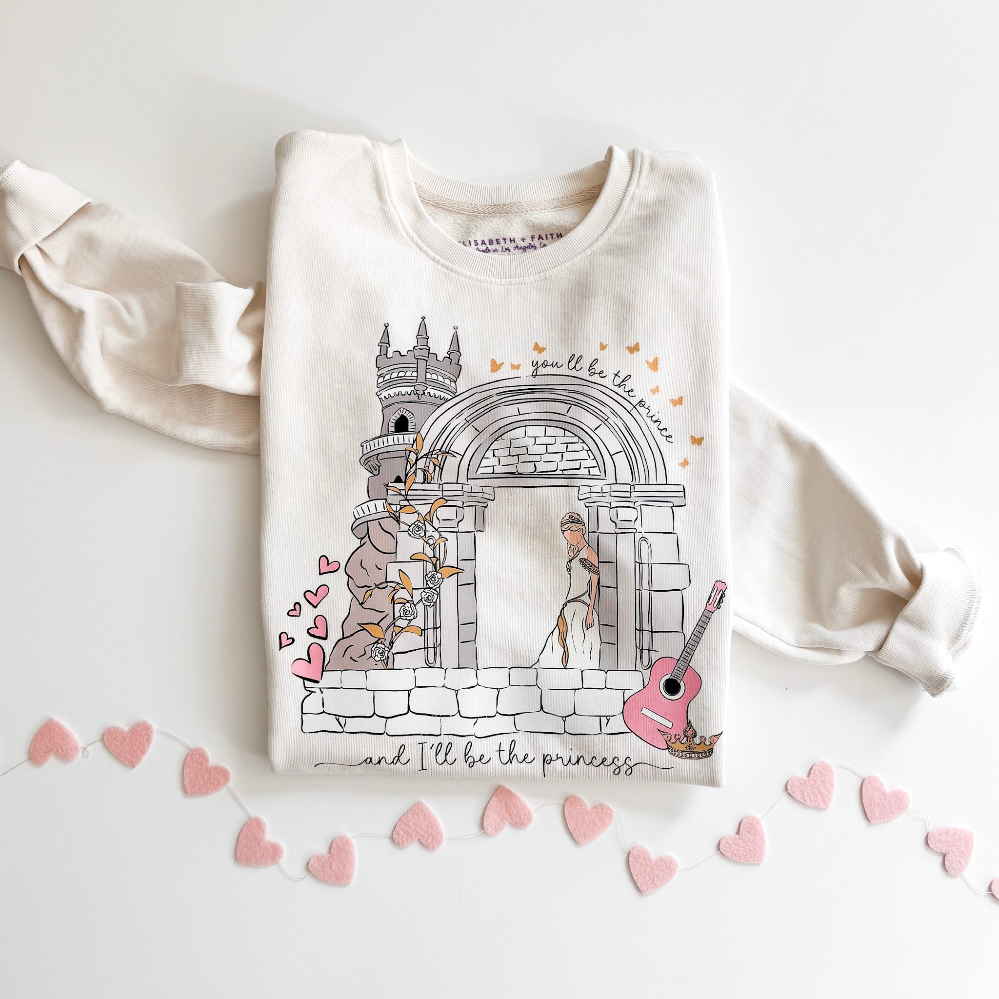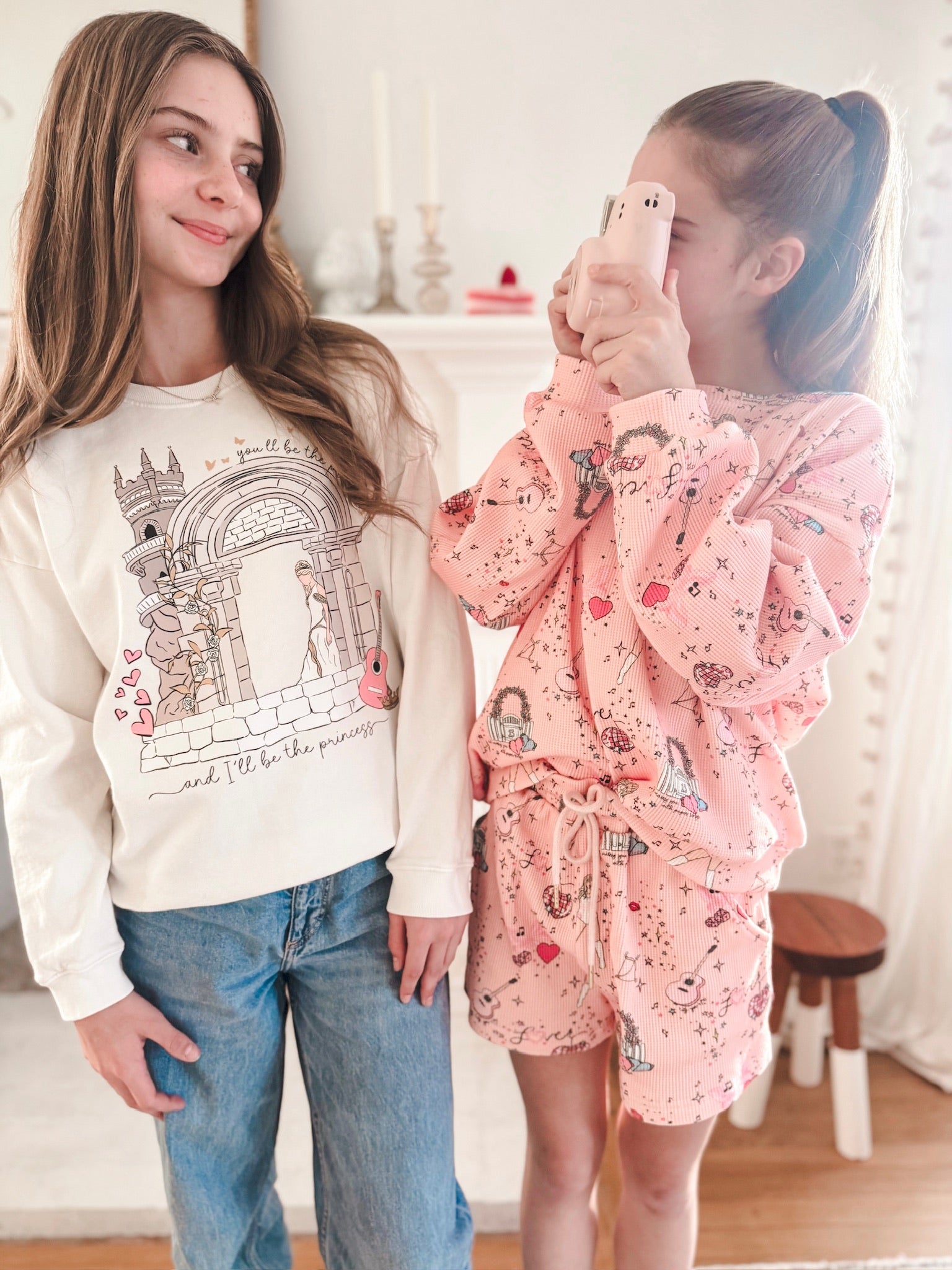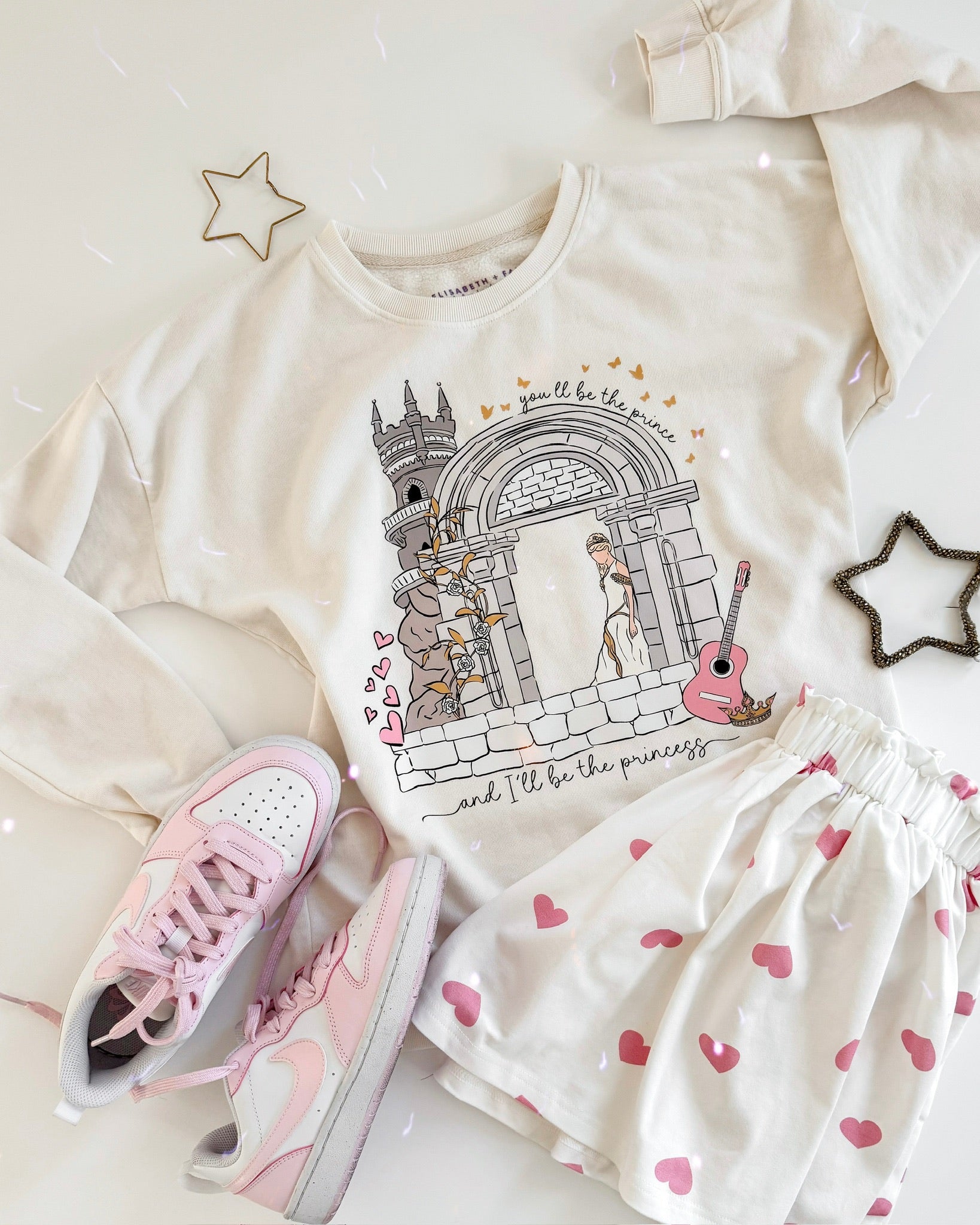 Inspired by a huge favorite, Love Story. We decided it was only fitting to add this custom design, in collaboration with Simply Favi to the LOVER collection. Available for women and kids! We're obsessed with the details, from the dreamy castle, the flowering vine and of course, the "princess" - we hope you love it as much as we do! Available in pink pullovers and boxy pink tees too! Pairs lovely with our pink confetti heart skirt.