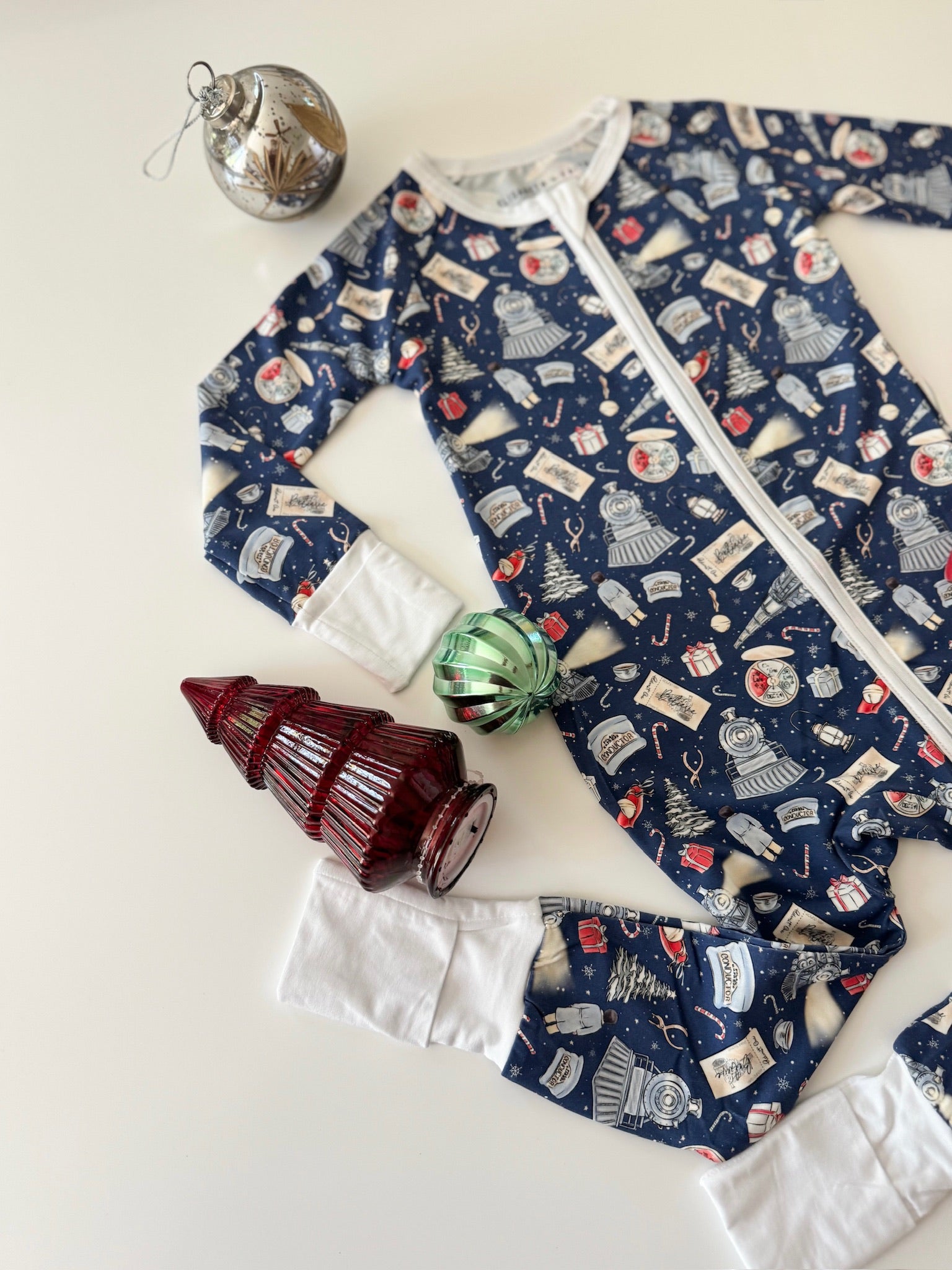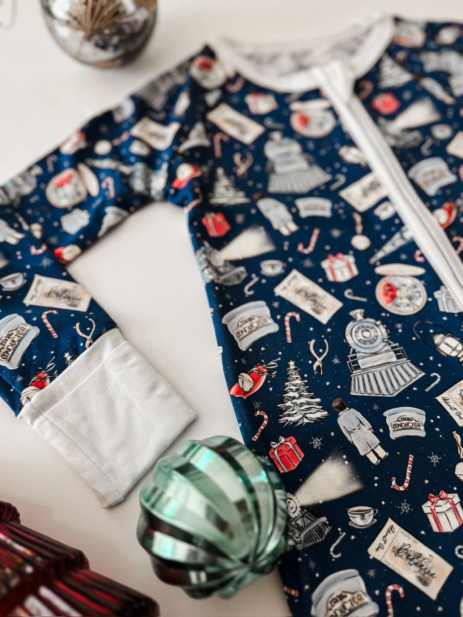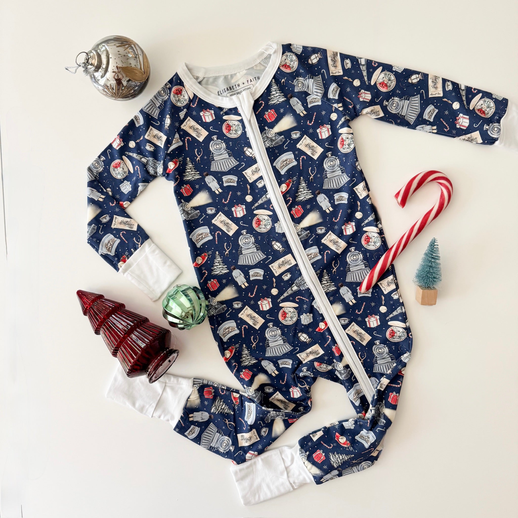all aboard...CHOO CHOO! Believe!!! Inspired by the magical, festive Christmas Train rides. Available for babies and kids. Babies sizes 0-3 to 18/24 are a zipper onesie. Other kids sizes are a two piece set with snow colored trim.