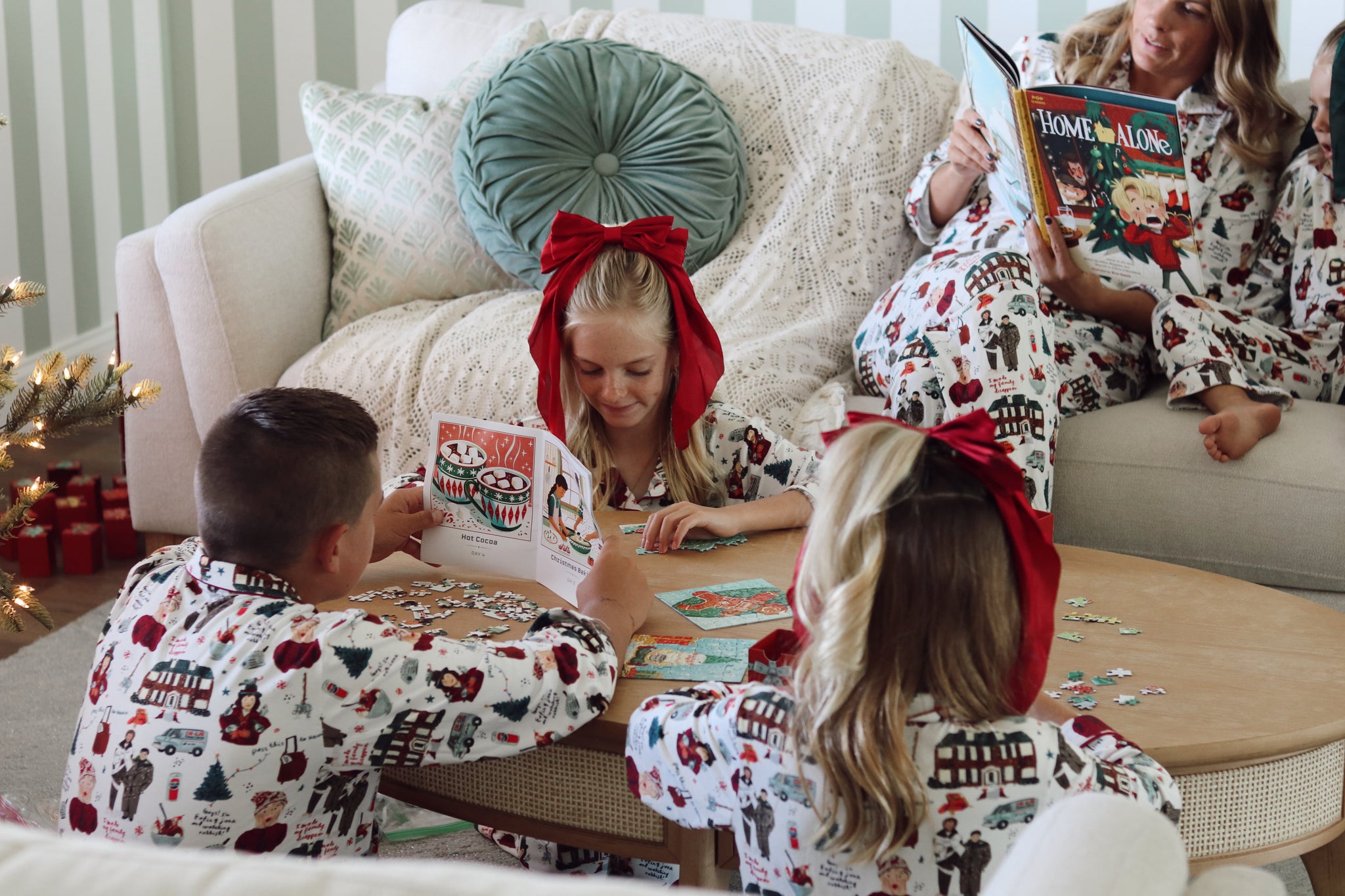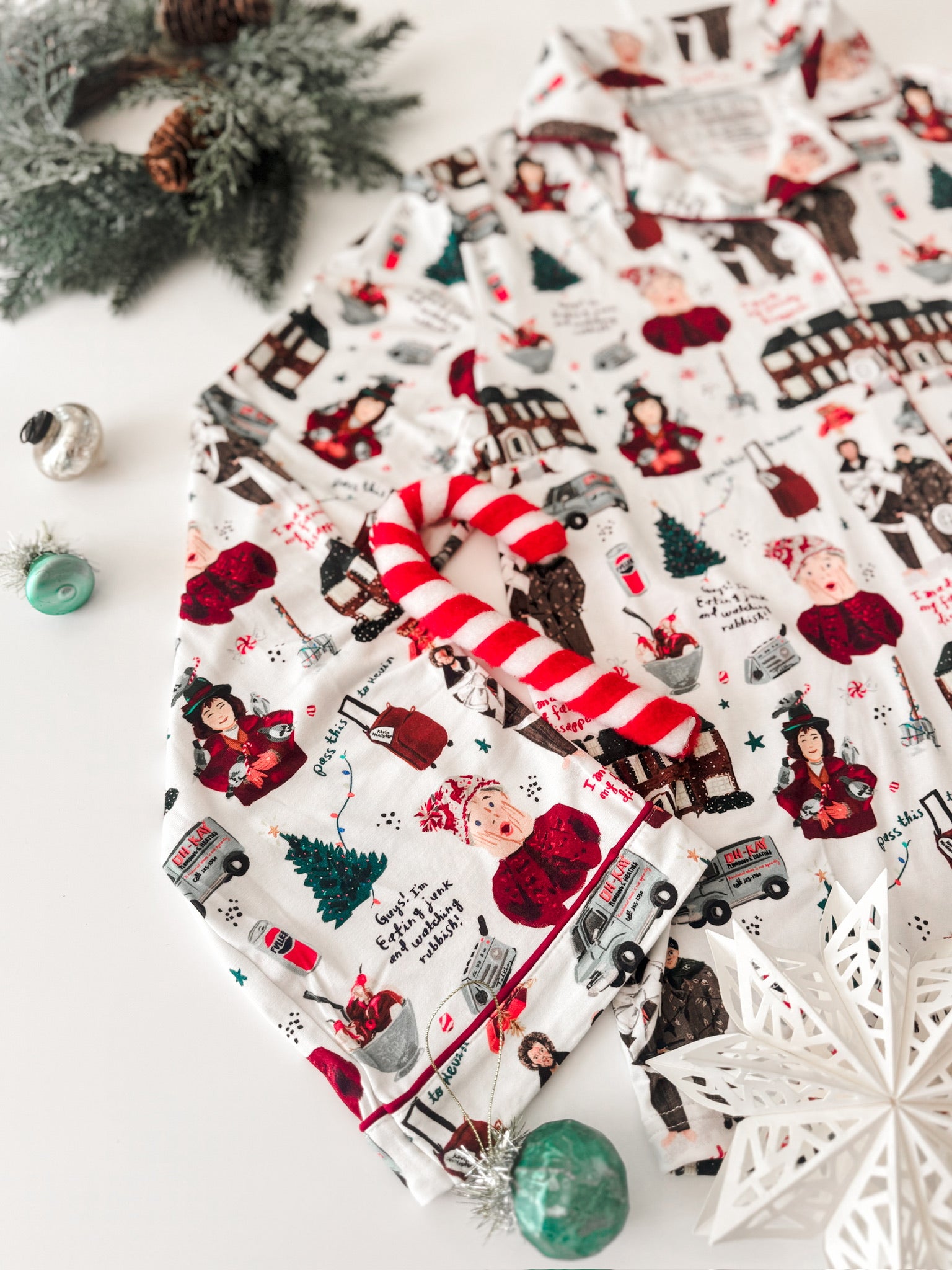 Cozy up to family movie nights with this exclusive print done for us by the late and talented Nysha Lilly. By customer demand, we have brought back this print for you in a new design and trim color. Button down for women and kids with the most festive burgundy trim and matching pajama bottoms for men.